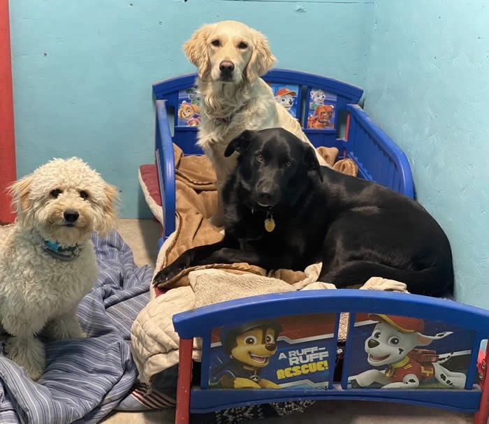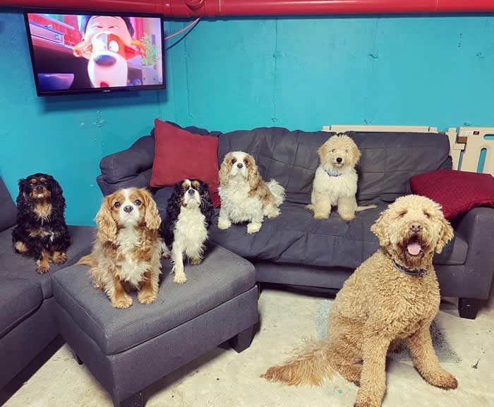 Here at Camp Cupcake, we have a spacious lower level "pet paradise" area with Dog TV and Alexa radio. Dogs can lounge on couches & dog beds with thier friends - and for those canines that need some quiet time, we can provice crates and/or separate "suites" for privacy.